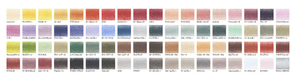 ドローイングの油性色鉛筆は、これまで 6色、12 色、24 色の3種類のセットをご用意していましたが、今まで以上に色彩豊かな作品を描くことができる36色と72色のセットを今回新たに発売します。既存の24色に加え、新たに加わる色の中には、「オータムレッド」「スイートバイオレット」「セージリーフ」「ライトラスト」など発色の美しい鮮やかな色味から、「ポーラーアイス」「グリーンアース」「オータムリーフ」「サンフラワー」など自然を連想させるアースカラーが加わり、これらの48色の新色が加わることでより一層ドローイングの魅力を楽しみながら使用することができます。